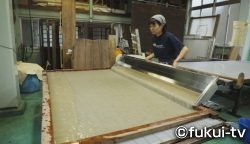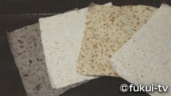 越前和紙の老舗、五十嵐製紙。伝統工芸士として和紙を漉く五十嵐匡美さんが、和紙の新しい可能性を模索して、今年漉き始めたのが「フードペーパー」です。フードペーパーは、ニンジン、タマネギ、ミカンなど、様々な食材を原料とした和紙。使う材料によって風合いが変わるのが特徴です。