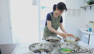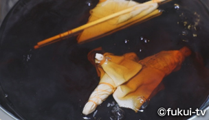 草木染とは、天然の植物を染料として染める技法で、身近な植物から意外な色合いが作り出せる面白さがあります。永登さんが作っていたのは高浜町特産の杜仲茶を使った染料。20分ほど煮出し色が出たところに布地を入れます。30分ほど漬けたところで「色止め」として金属イオンを入れて出来上がり。草木染めは自然の中の化学変化を楽しむという一面もあるのだそうです。