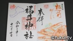 福井神社の御朱印が参拝客の間で人気を集めています。御朱印には、「誕生月の花」「風物詩」「福井県の特産物」の3種類があり、いずれも毎月図柄が替わります。例えば11月の誕生月の花は「椿」、風物詩は「小春日和」、福井県の特産物は「越前がに」となっています。