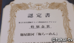 開発に半年ほど掛け、ようやく完成した「梅らーめん」。最高賞である特別金賞を受賞したコンテストは、「全国梅サミット特産品セレクション」。これまでになかったアイデアと味が評価された結果でした。