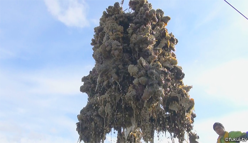 小浜湾で、牡蛎(カキ)の養殖がはじまったは、昭和5年。90年前のことです。稚貝を付着させたホタテ貝を数珠つなぎにして海の中に吊るして育て、ちょうど今の時期に水揚げします。