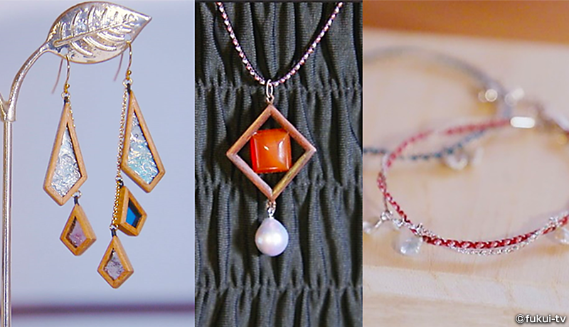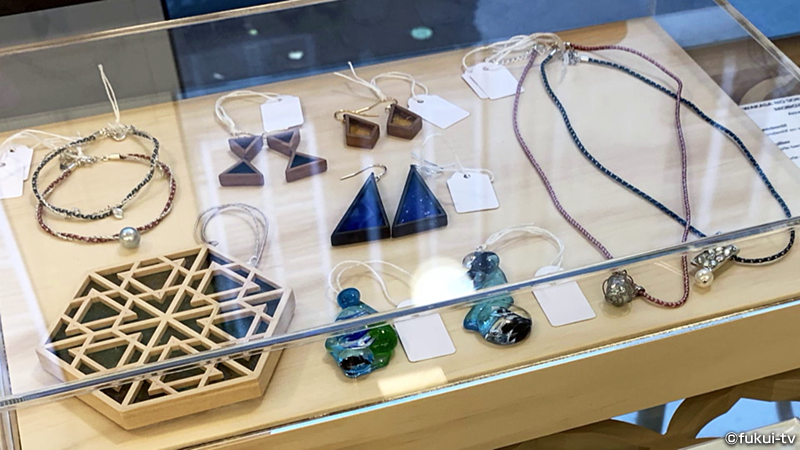 「若狭の空と海とものづくり」では、9人の作家が活動。アイデアを出し合い、コラボ商品も手がけました。そのひとつが、若狭めのうを組子細工で囲み、若狭パールをあしらったネックレス。また、組紐と若狭パールを組み合わせたネックレス、ガラスと組子細工のイヤリングなど、次々と商品が生み出されています。