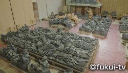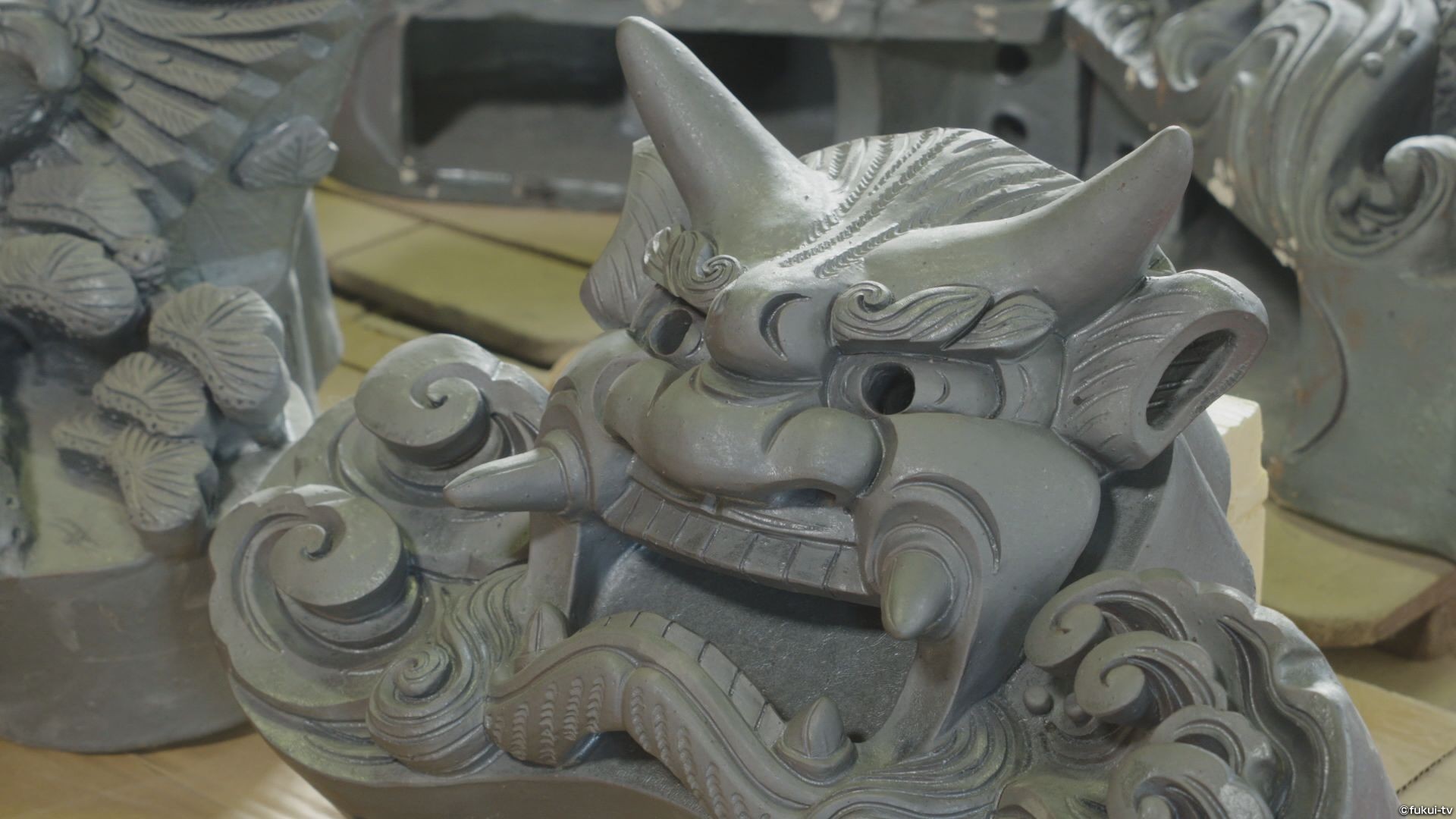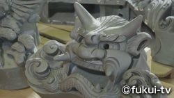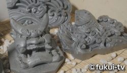 鬼瓦の製作には主に武生でとれた粘土を使います。一般的な押し型で作られる鬼瓦と違い、北川さんの作る鬼瓦は、意匠を凝らした細かい細工が施されています。そのため、造形だけで約2週間、焼きあげて完成するまでには約4か月かかります。