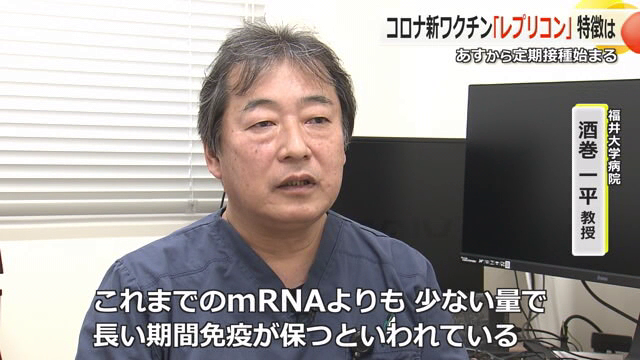 福井大学病院の酒巻一平教授は「これまでのワクチンの中心はmRNAというワクチンだったが、レプリコンワクチンは、このmRNAを体の中で増幅することができるので、これまでよりも少ない量を打つことで長い期間免疫が保たれるといわれている」と話します。