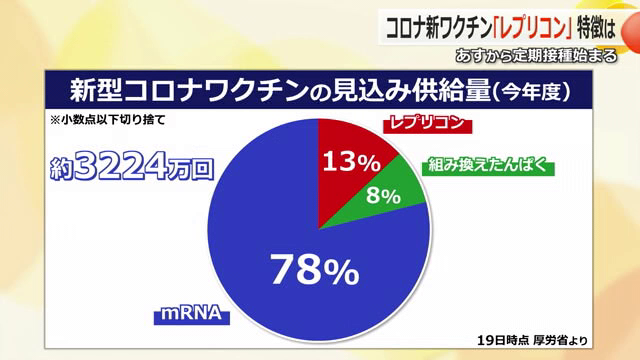 厚生労働省によると国内のワクチンの供給量はレプリコンワクチンが約430万回分の見込みで、ワクチン全体の割合でみると約1割。ファイザーやモデルナといったmRNAワクチンが約8割を占めます。