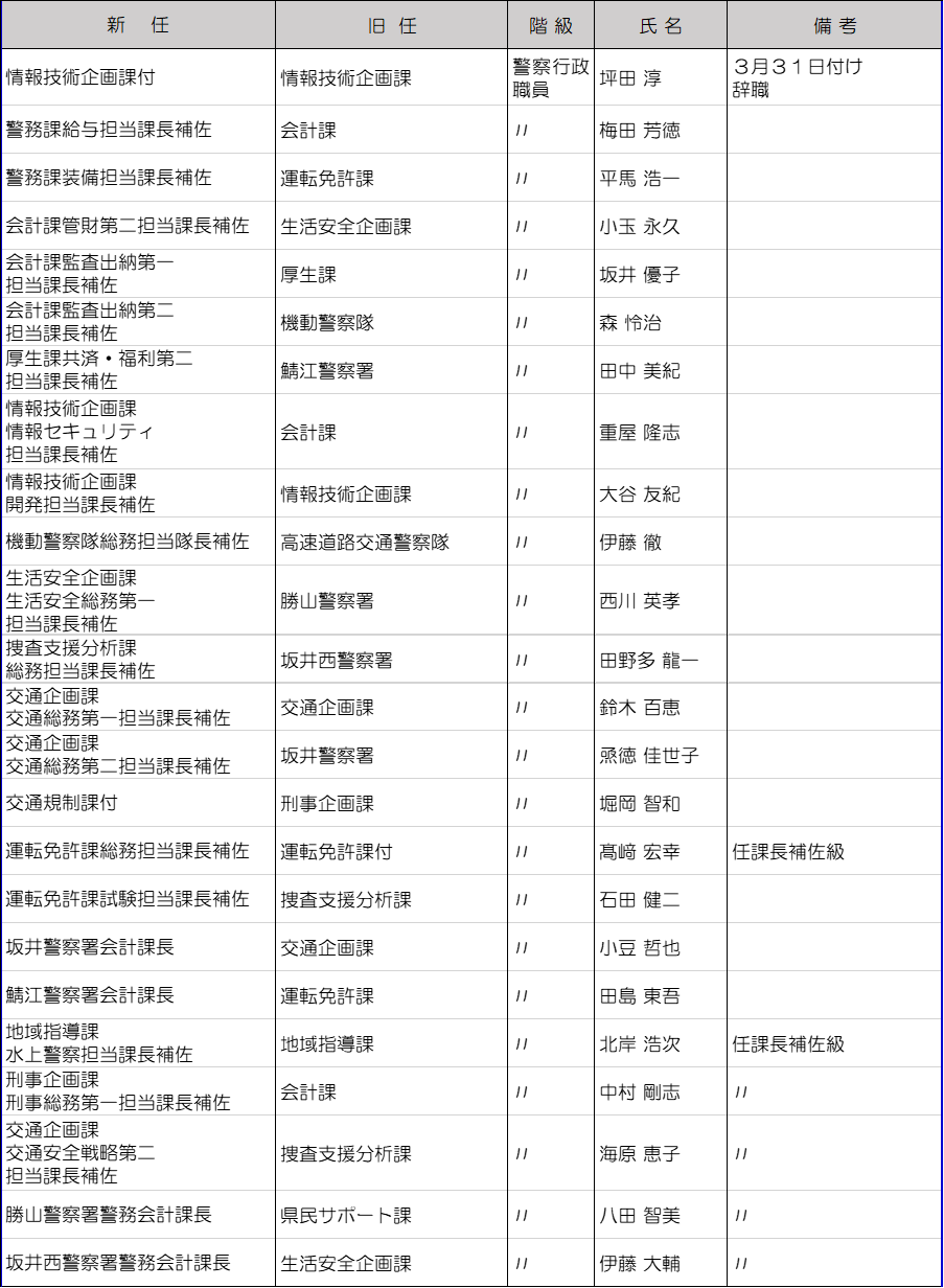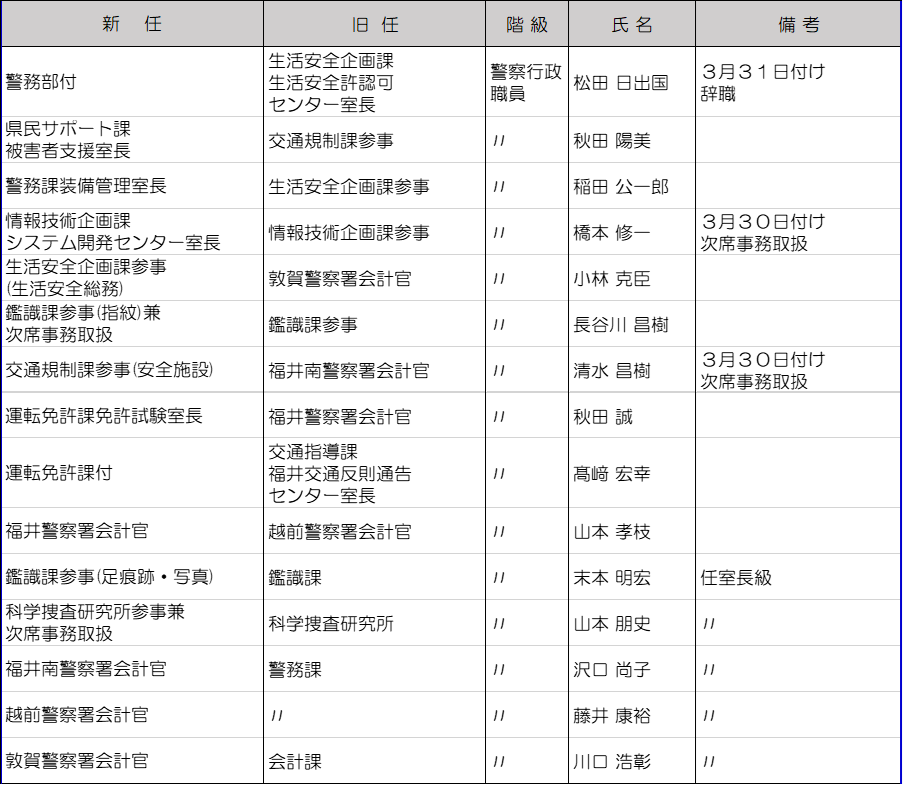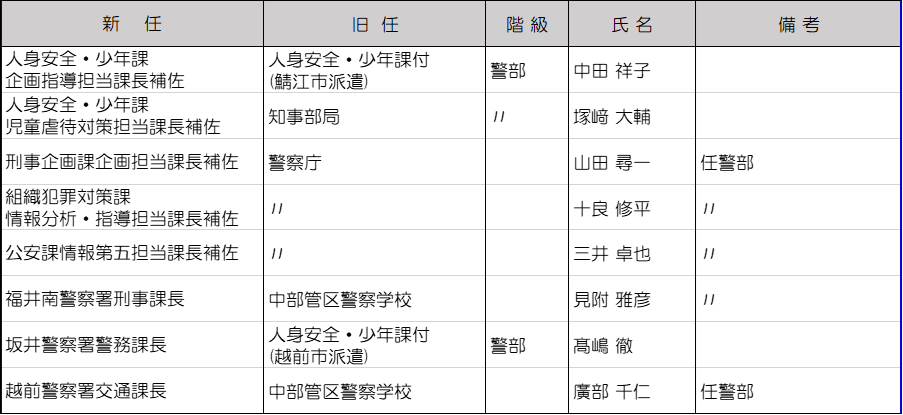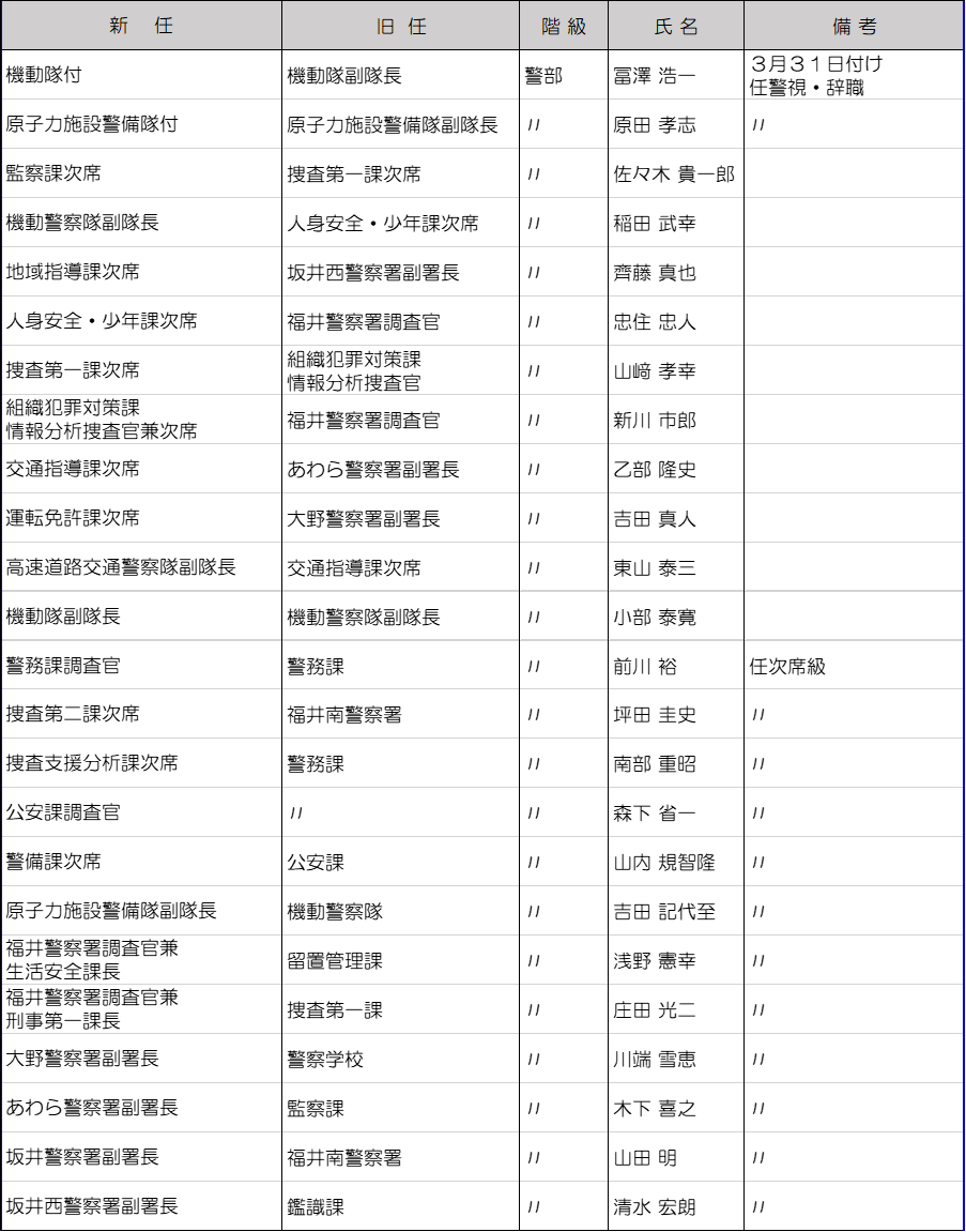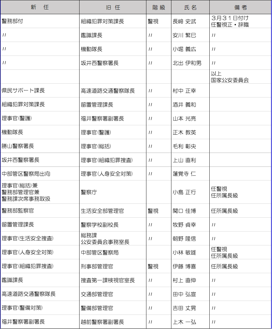 福井県警は3月10日に春の人事異動を内示した。管理職以上の警察官及び一部職員は3月23日付、それ以外は3月30日付の発令。今回の異動では、大きな組織改編はなかった。