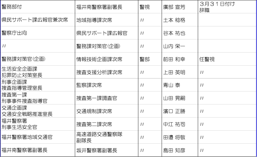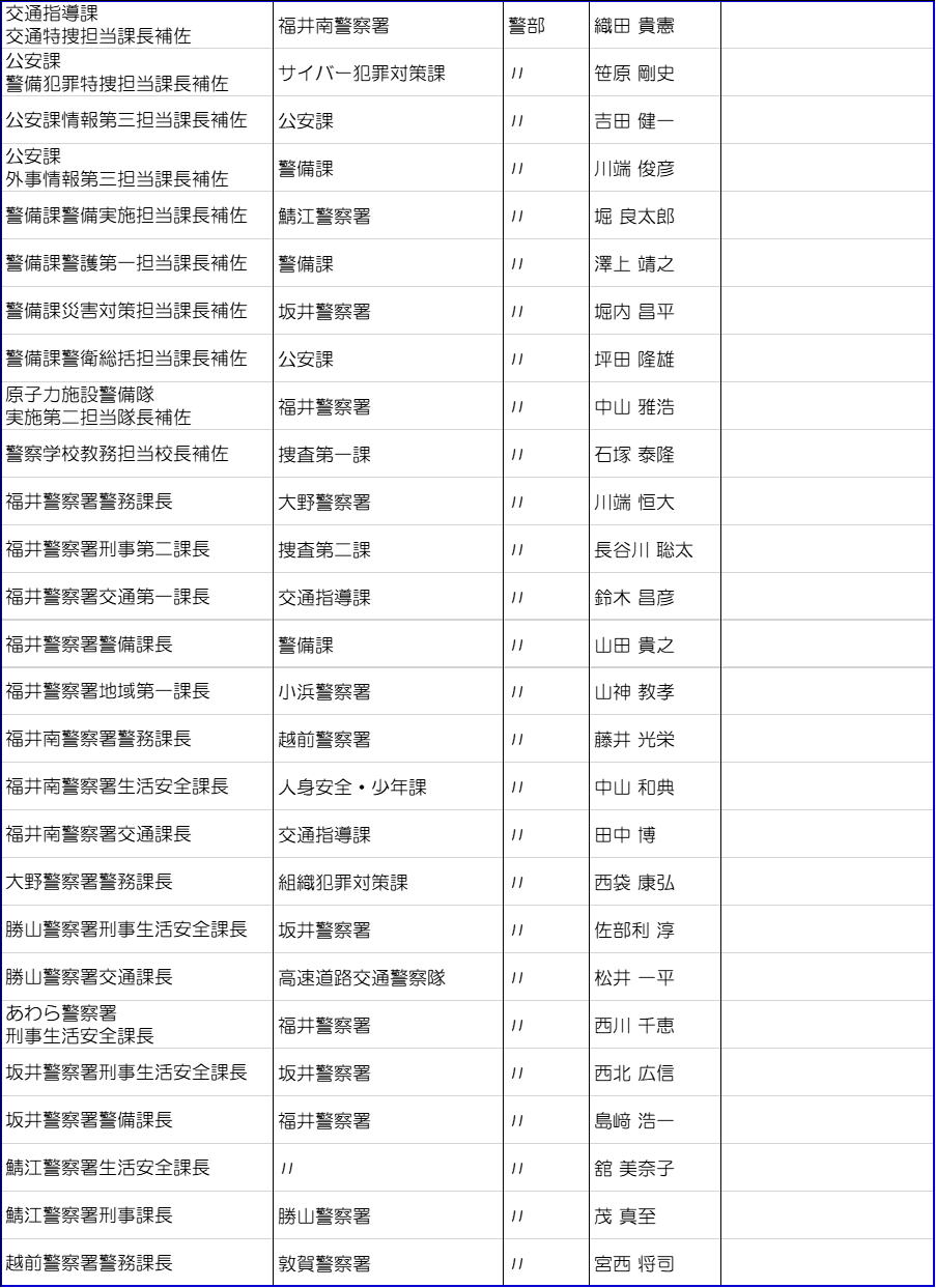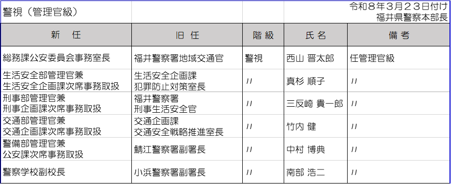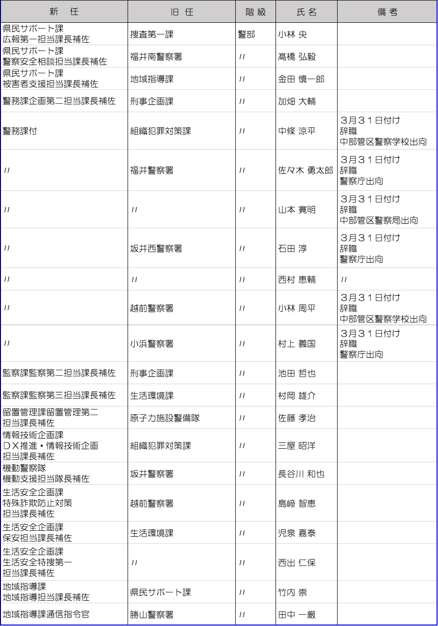 福井県警は3月10日に春の人事異動を内示した。管理職以上の警察官及び一部職員は3月23日付、それ以外は3月30日付の発令。今回の異動では、大きな組織改編はなかった。