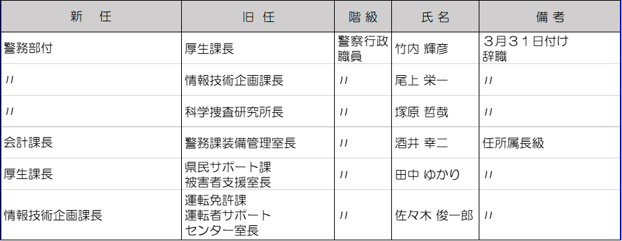 所属長級の警察行政職員は6人が異動。