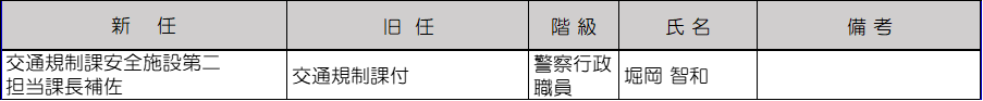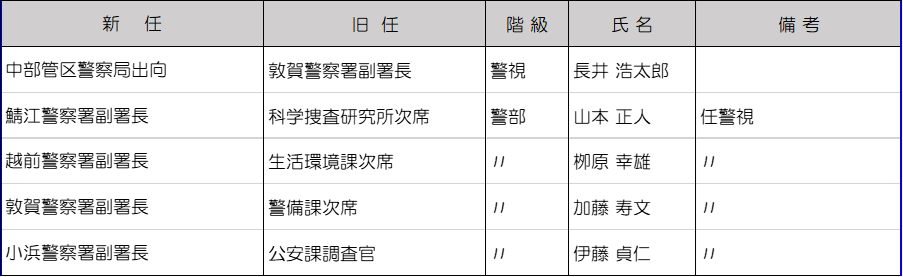 中部管区警察局への出向は1人、各署の副署長新任は4人。