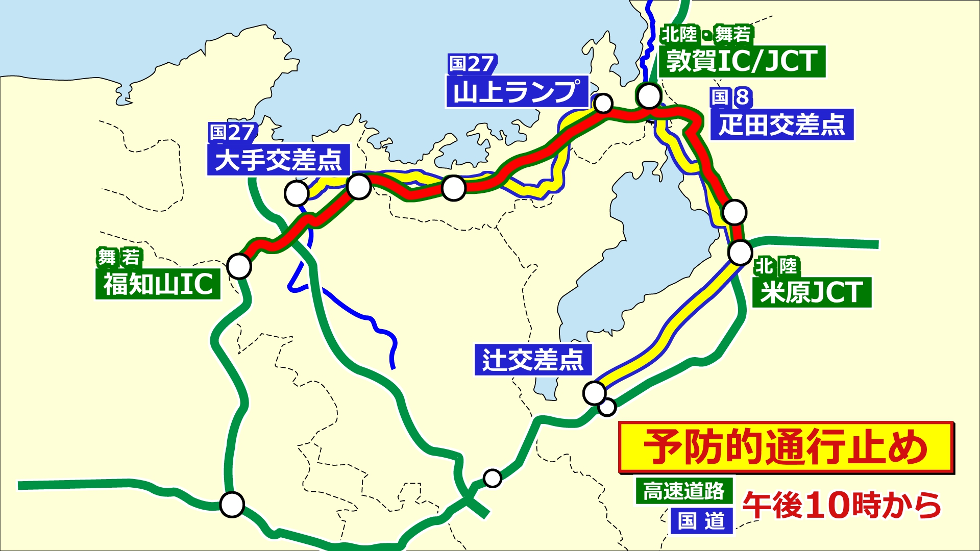 【速報】22日午後10時頃から予防的通行止め開始 北陸道・敦賀IC-米原JCT 舞鶴若狭道・敦賀JCT-福知山IC 国道8号や27号でも