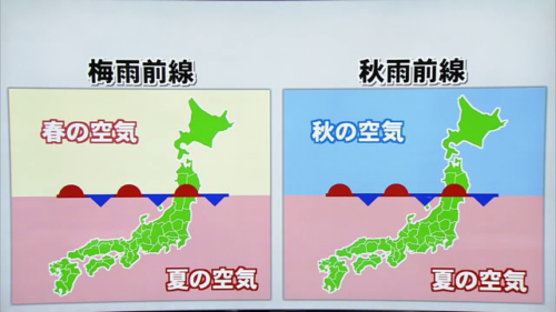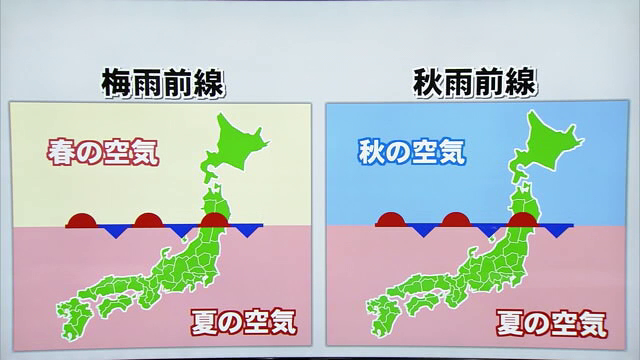 秋雨前線は、冷たい空気と暖かい空気がどちらも勢力が強くぶつかりあっている状態です。いまはちょうど、秋の空気と夏の空気がせめぎ合っているのです。