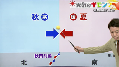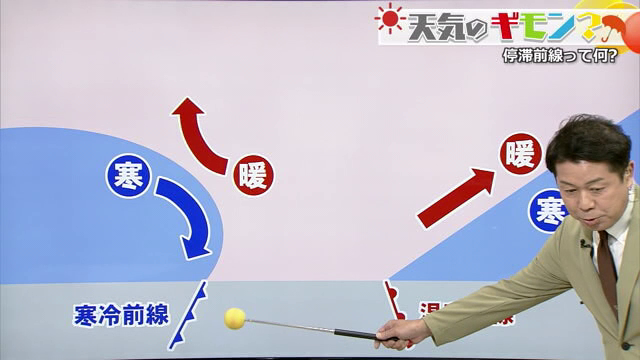 視聴者から寄せられた天気にまつわる素朴な疑問や、珍しい気象現象、知りたいことなどを村田気象予報士がわかりやすく解説する「天気のギモン」のコーナー。今回のテーマは「停滞前線ってなに?」です。