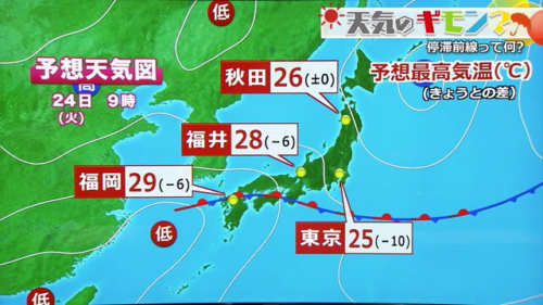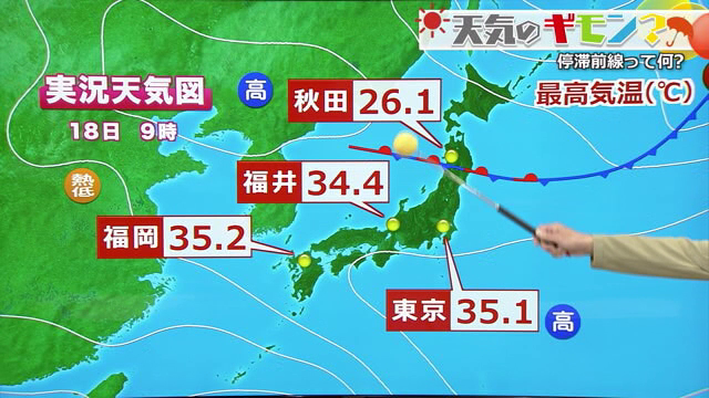 18日の天気図では、秋雨前線は東北地方に停滞していて、前線の北の秋田は最高気温が26.1度である一方、前線の南は35度前後まで上がっています。