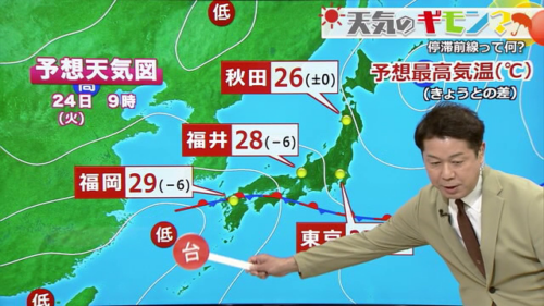 来週の火曜日、24日になると、前線が 九州北部から四国まで南下します。これにより最高気温が福井は28度、東京は25度と一気に下がる予想です。