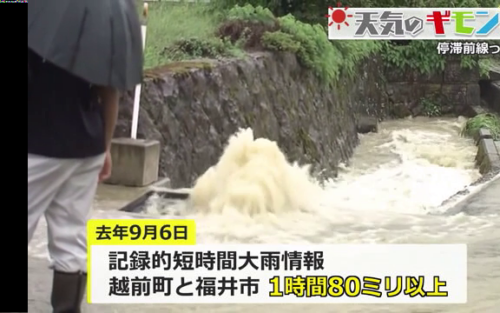 2023年9月6日がその例です。熱帯低気圧の影響で秋雨前線の活動が活発となり、福井市と越前町で1時間に80ミリ以上の猛烈な雨が降り、記録的短時間大雨情報が発表されました。
