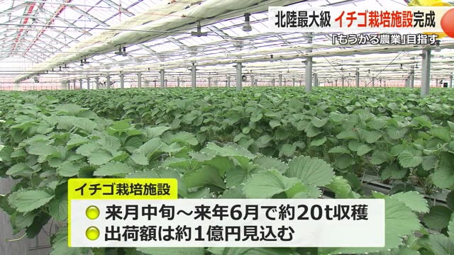 越前市内に18日、北陸最大級となるイチゴの栽培施設が完成しました。温度や水、光を自動で管理するシステムを取り入れたスマート農業で「もうかる農業」を目指すとしています。