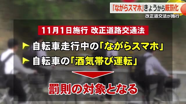 11月1日から「改正道路交通法」が施行され、自転車走行中のスマートフォンなどの使用や酒気帯びでの運転が罰則となり、違反すると懲役や罰金刑が科されます。福井南警察署は、今回施行された改正道路交通法を知ってもらおうと、1日、福井市内で啓発活動を行いました。今回、強化・整備された罰則とはどのようなものなのでしょうか。