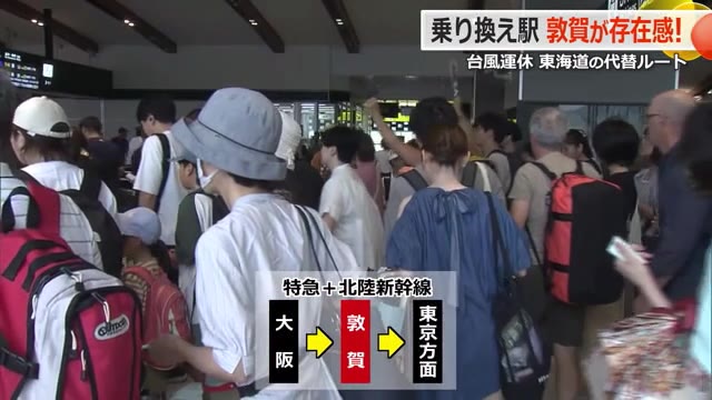 お盆のUターンラッシュ真っ只中の16日、台風7号の影響で東海道新幹線が運休し、空の便の欠航が相次ぎました。北陸新幹線と特急列車の乗り換え駅となる敦賀駅は、本州の日本海側の中継地点としてUターン客や旅行客でにぎわいました。