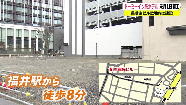 福井駅西口からは徒歩8分の場所です。建設されるのはドーミーイン系列の「御宿野乃(おんやどのの)福井(仮称)」。和の空間をモチーフに地域に根差した食の提供や大浴場やサウナなどの設備が充実した快適な空間が魅力で、現在全国に10施設あります。