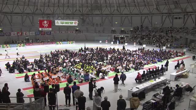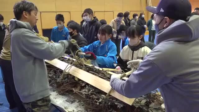 15日は小浜市の小浜美郷小学校の6年生と保護者合わせて80人が学校の体育館に集まりたいまつ作りに挑戦。