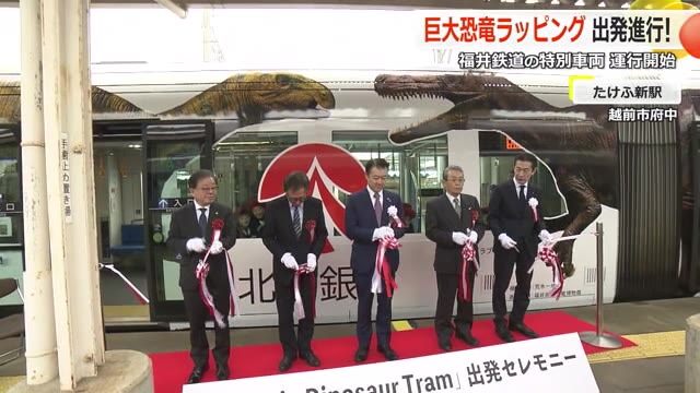 巨大な恐竜がラッピングされた福井鉄道の車両がお披露目され、28日朝、出発セレモニーが行われました。