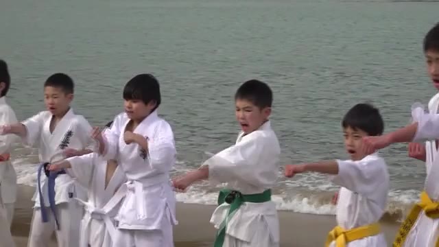 小浜市の海岸では、寒空のもと空手の寒稽古が行われ、子どもたちが心と体を鍛えました。