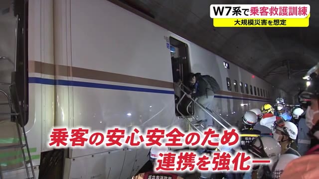 北陸新幹線県内開業を前に、JR西日本金沢支社は、県警や消防と合同で大規模災害が発生した際の乗客の救護訓練を、北陸新幹線の車両「W7系」を使って行いました。