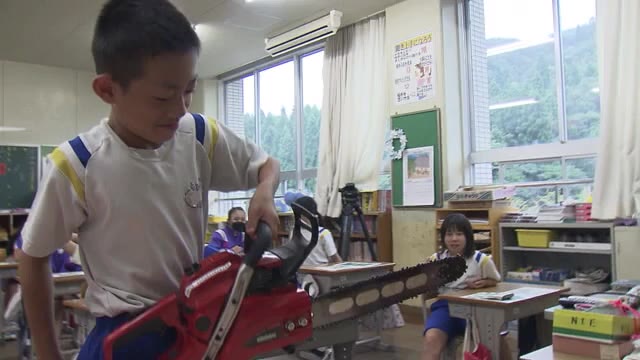 そのあと、児童たちは木を切る際に使うチェーンソーに触れ、その重さや機械の大きさを体感していました。