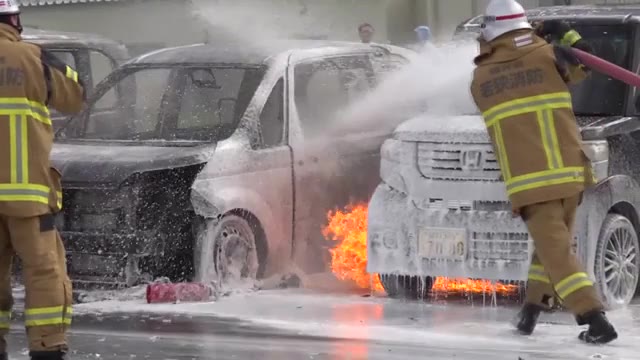 午後1時すぎ、工場の従業員から「乗用車が燃えている」と消防に通報がありました。消防車など7台が出動して消火にあたり約1時間後に火は消し止められましたが、止めてあった軽乗用車3台も燃えました。けが人はいませんでした。