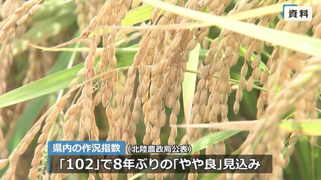北陸農政局によりますと、平年値を100とした県内の「作況指数」は10月25日時点で「102」で「やや良」となる見込みです。101を超えるのは8年ぶりです。