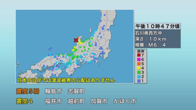 午後10時47分ころ、北陸地方で震度5弱の地震がありました。震源地は石川県西方沖で、震源の深さは10km、地震の規模はM6.4と推定されます。 福井県内の主な震度は以下の通りです。 【震度4】福井市 越前町 【震度3】坂井市 越前市 鯖江市 大野市 あわら市 勝山市 永平寺町 敦賀市 小浜市 若狭町 高浜町