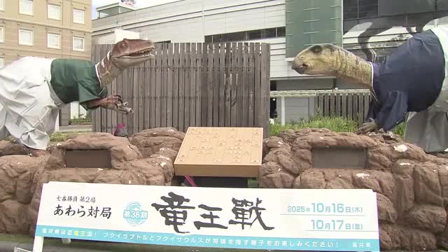 向き合う2体の恐竜を将棋の棋士に見立ていて、間に置かれた将棋盤は、去年あわら市で開かれた竜王戦第2局の一日目終了時点の棋譜が再現されています。