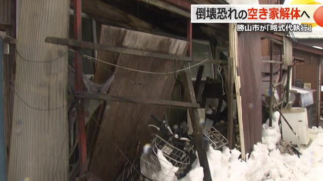 こうした中、勝山市は3日、法律に基づいて空き家を撤去する「略式代執行」を始めました。「略式代執行」とは、空き家等対策の推進に関する特別措置法第22条第10項の規定に基づいて、所有者が不明な空き家を、行政が費用を片代わりして解体することです。
