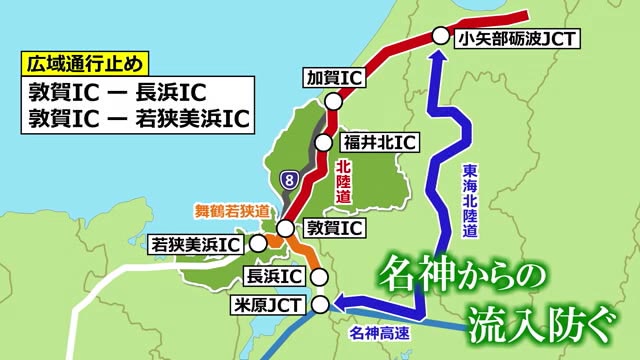 18日の午後4時頃をめどに、北陸道・敦賀IC-米原JCT間、舞鶴若狭道・若狭美浜IC-敦賀JCT間、国道8号の敦賀市以南の同時通行止めを開始する予定です。