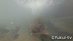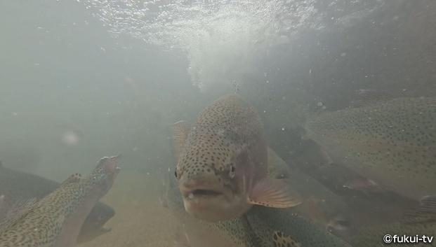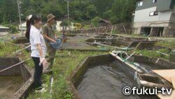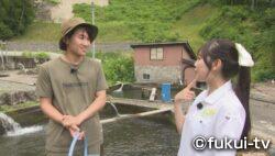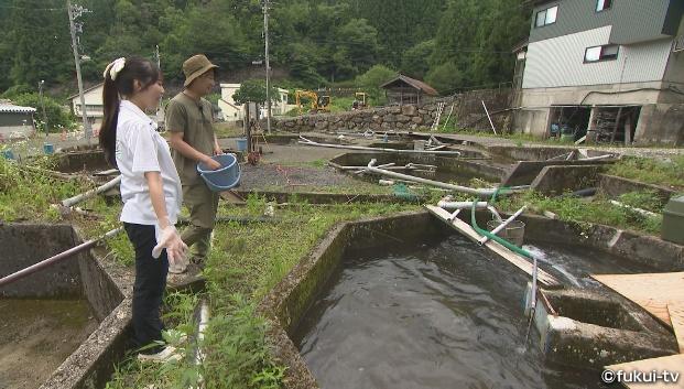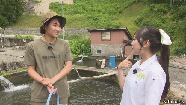 福山研究員がまず向かったのは、勝山市野向町の山あいにある「あまごの宿」。ここには淡水魚の養殖場が隣接していて、おいしいアマゴやイワナを提供しています。その養殖場に待っていたのが、今回のわがまちプレーヤーの村上雄哉さん。幼いころから魚が大好きだったという村上さん。釣りの腕前は超一流で、アユ釣りの全国大会で準優勝した経歴を持つ実力者です。