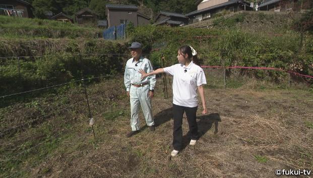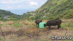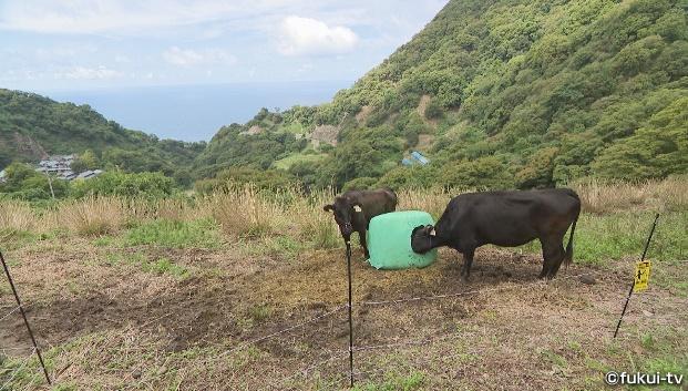 呼鳥門と日本海、そして越前水仙を一望できる場所は、毎年全国からカメラマンが殺到するほどの人気の撮影スポットになっていました。しかし、今では、その「風景」は、ほとんど見ることができなくなっています。獣害の影響です。「地域の宝・越前水仙」を守るため、スイセン農家が、今年新たに取り組んだことがあるということで、滝本さんに案内してもらうと、福山研究員が見つけたのは、ウシ、2頭の若狭牛です。滝本さんが会長を務める、越前水仙の産地再生に取り組む農村型地域運営組織協議会「MISAKI未来」は、今年8月、獣害によって耕作放棄地となってしまった畑に若狭牛を放牧。福井県によると、ウシの放牧により野生動物の隠れ家となる雑草を食べ、また、人と野生動物を住み分ける境界線となり、畑への野生動物の侵入を防ぐことができるそうです。
