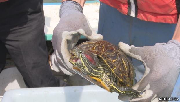 三方五湖で、いま問題となっている外来種は、「ミシシッピアカミミガメ」なのだとか。かつては、“ミドリガメ”の名前で、祭りの露店で販売もされていたアカミミガメですが、ペット用に飼育していたものの飼えなくなった一部の人たちが不法に放流し、三方五湖で爆発的に繁殖してしまったのだといいます。