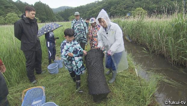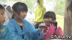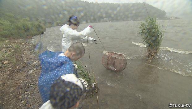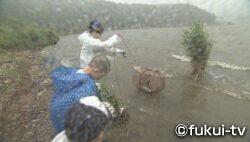 悪天候の中、参加した子どもたちと一緒に懸命にワナを回収。この日は、13匹のアカミミガメの捕獲に成功しました。三方五湖で捕まえた外来種は、実は道の駅三方五湖で回収。300グラム当たり100円の商品券と交換することができます。最後に、富永さんにパワーボールに思いを込めてもらいます。