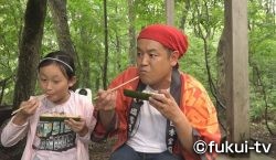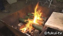 続いて、キャンプ場をあとにし向かった先は、六呂師高原。ノーム自然環境教育事務所の坂本さんと再会です。この日はあいにくの雨だったため、体験内容を変更し、竹を加工して炊き込みご飯を作ることに。まずは竹を必要な長さで切る作業。隊長は順調に切り進め、あっという間に切り終えます。次は「竹飯ごう」づくり。ノコギリとノミを使い、竹に穴を開けていくんですが、なかなかうまくいきません。それでもあきらめずにノミを入れ続け、なんとか竹筒飯ごうを完成させるのでした。