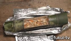 炊きあがりを楽しみにする隊長。しかし数分後、かまどの竹筒を見ながら緊迫するノームスタッフの姿があります。よくよく竹筒を見てみると、なんとトラブル発生中!実は、竹筒が焦げすぎて穴が開きそうな状況。竹筒をアルミホイルで覆って応急処置をしました。