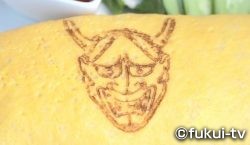 歩き回っておなかが減った隊長は、道の駅でオムライスをいただくことにしました。実はこのオムライス、焼き卵の表面に鬼のお面が書かれているんです。