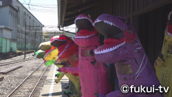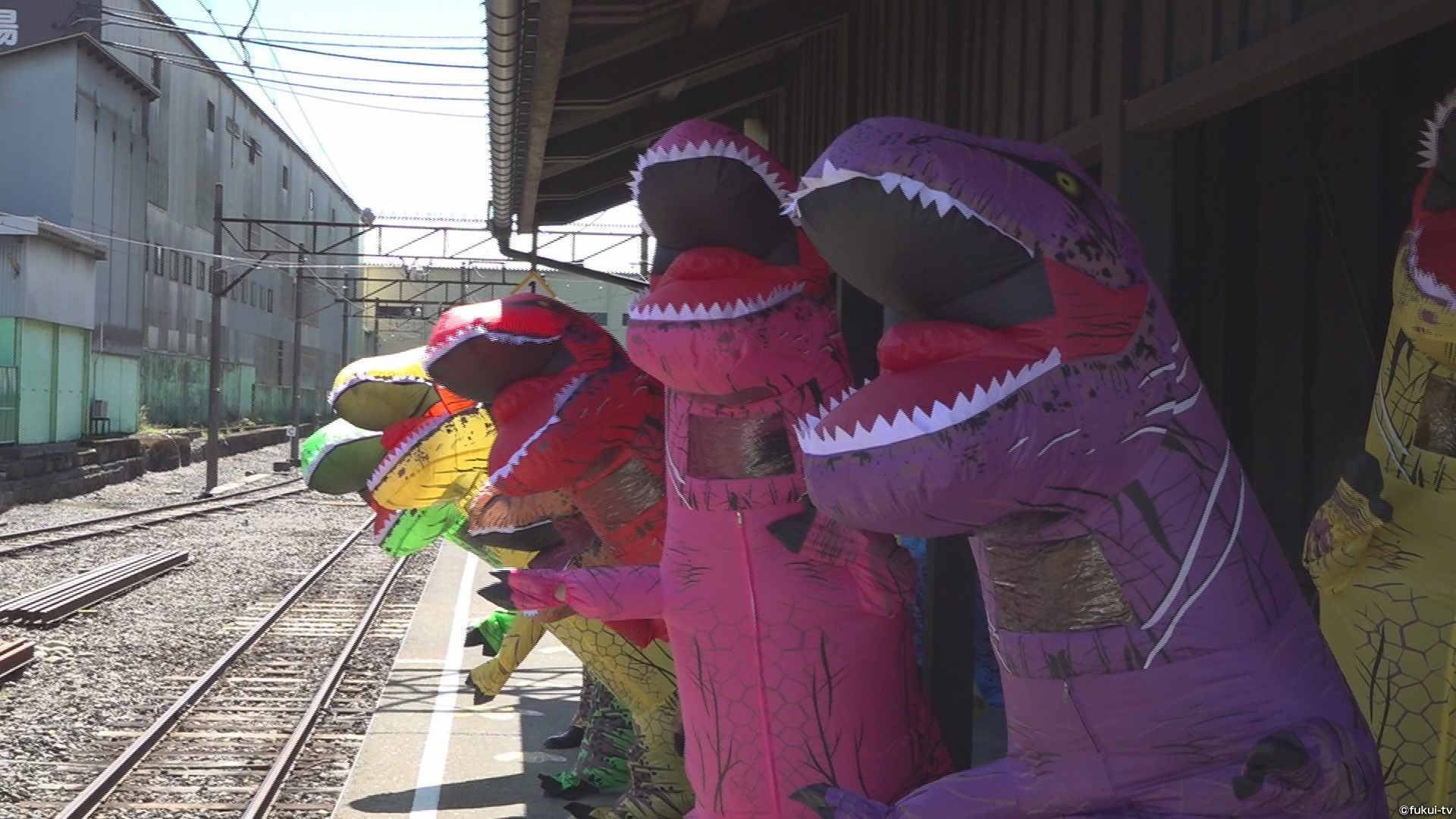 駅のホームにならぶ恐竜は福井をもりあげたいという熱い思いをもった人たちによるものだった。ワンダー。