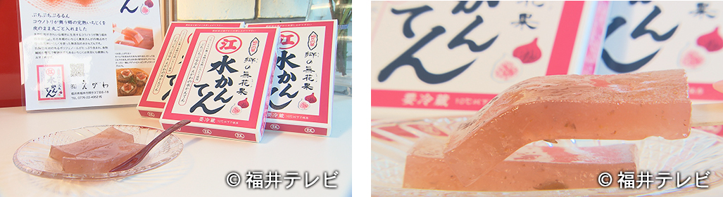 老舗菓子店「えがわ」の新商品、無花果(いちじく)水かんてん。無花果の名産地、福井市本郷地区の完熟無花果を厳選使用。 無花果のぷちぷちとした食感と、寒天のぷるんとした喉越しを楽しめる夏にぴったりのスイーツ。