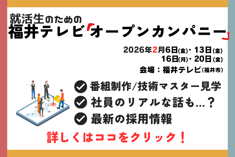 福井テレビでは、2027年3月に高専・大学、大学院修士課程を卒業予定の皆さんを対象に、オープンカンパニーを実施します。