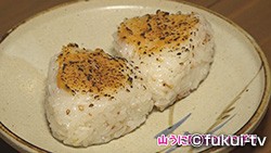 (2)(1)のおにぎりの片面に「山うに」と味噌を1対1で混ぜたものを塗ります。