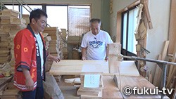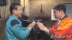 越前市では漆の製造販売を行う箕輪漆行さんにお邪魔しました。作業場に入り、桑原隊長が驚いたのが漆独特の香り。時には咳き込むことも。漆の樹液から、塗りで使う「漆」の製造工程などを見せてもらいました。