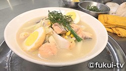 「太平燕」とは、たっぷりの野菜と緑豆はるさめが入った具だくさんのスープ料理。やさしい味わいのあっさりスープに、「ふくいサーモン」を加えて「ふくいサーモンの縁結び太平燕」が完成。