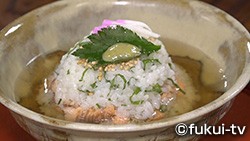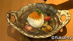 向かったのはイタリアン居酒屋「厨ぼうず」。実はこの店の店主桝家さんは勝ち山ぼっかけ連盟会長を務めてるんです!勝山で生まれ育った桝家さん、何か勝山に恩返しがしたいと勝山の新グルメ・勝ち山ボッカケを考えました。そんな勝山を愛する桝家さんが作ったぼっかけ「石焼きいくらボッカケ」を頂く事に。お出汁をかけるとジュウジュウ音を立てて、香りも見た目も抜群!