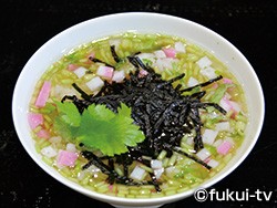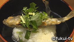 勝山の郷土料理「ぼかっけ」を調査した桑原隊長。ぼっかけとは、温かいごはんに三つ葉、かまぼこが入った出汁をかけて食べる勝山の縁起物だと知りました。