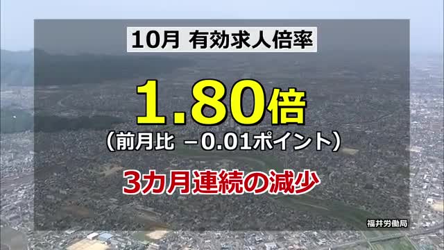 10月の有効求人倍率1.80倍で3カ月連続で減少 全国トップは維持「最低賃金引き上げの影響少ない」 福井労働局